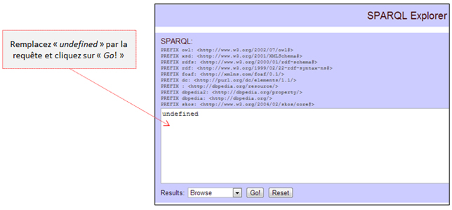 Lien direct vers l’application : https://dbpedia.org/snorql/ - Une fois l’interface SNORQL ouverte (voir la figure ci-dessous), copiez la requête suivante dans le champ de saisie, puis cliquez sur « Go! » pour exécuter la requête :