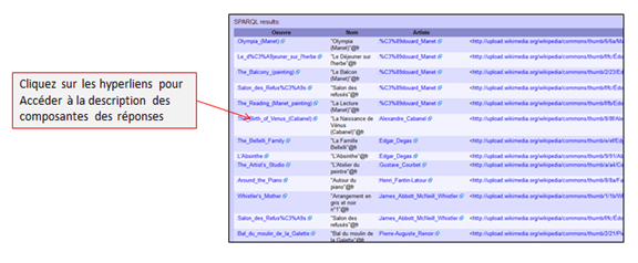 ORDER BY ?Artiste - Une fois affichés les résultats de la requête, vous pouvez cliquer sur les hyperliens présents pour consulter une description de la ressource à laquelle l’hyperlien fait référence (voir la figure ci-dessous).